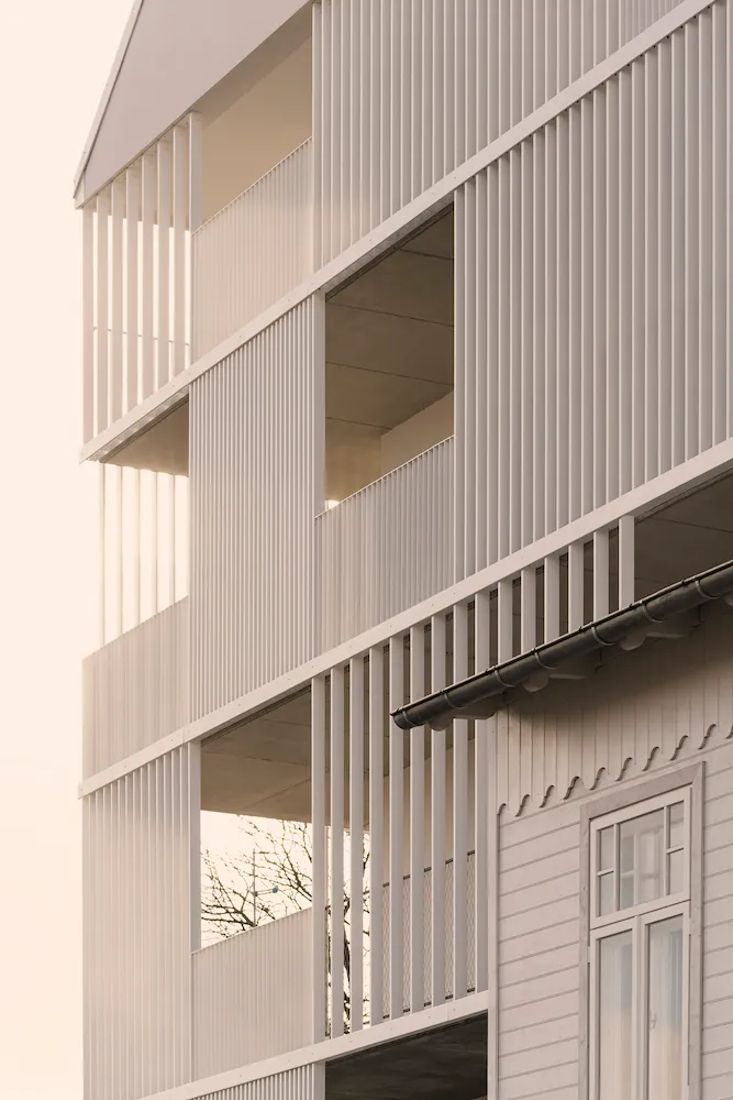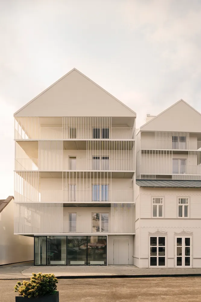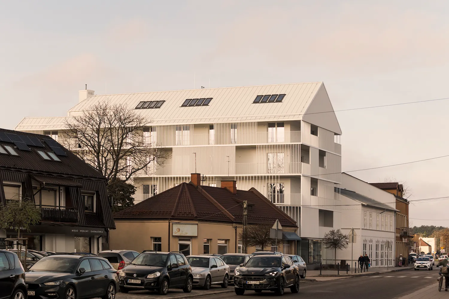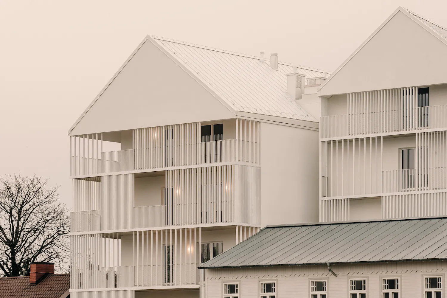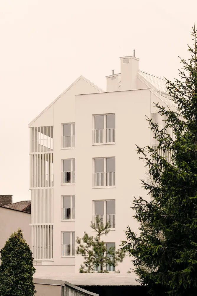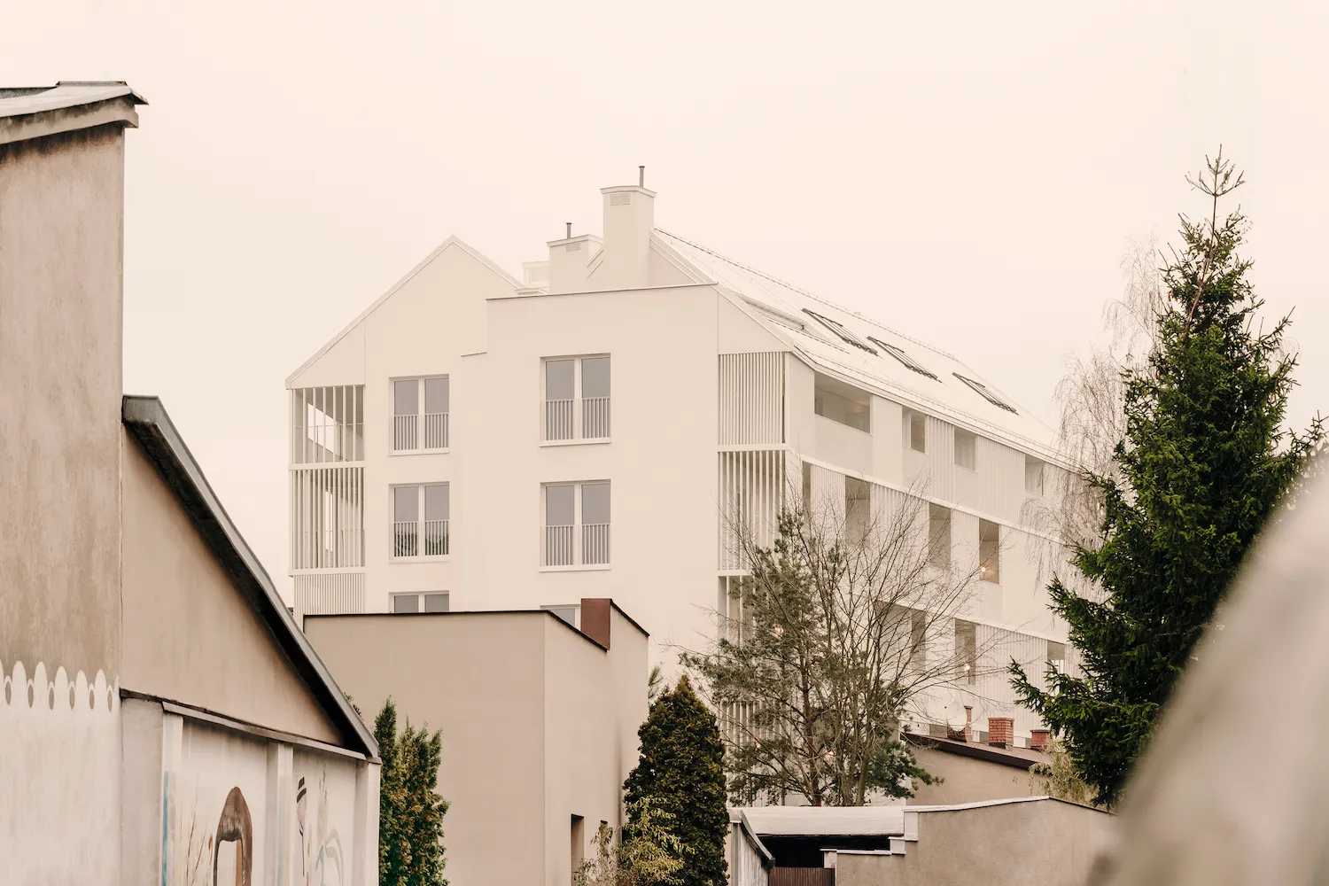 Bryła budynku podzielona została na dwie części o zróżnicowanym charakterze elewacyjnym oraz wysokościowym. Składają się na nią istniejący, dwukondygnacyjny budynek drewniany, oraz zupełnie nowa bryła o znacznie większych gabarytach. Jej prosta i delikatna forma w sposób przewrotny inspirowana jest stylem świdermajer, którego przedstawicielem jest niższy budynek. Przestronne balkony zostały zaprojektowane jako ażurowe werandy, doskonale nadające się do codziennego wypoczynku. Pionowe szprosy elewacyjne, z których składa się fasada, projektowane są jako elementy drewniane, malowane na kolor biały, który będzie dominującą barwą elewacji. Także malowana proszkowo w tym samym kolorze stal, z której wykonane będą zewnętrzne balustrady, korespondować będzie z ażurowym motywem fasady. Całość będzie ascetyczna w formie i kolorze dzięki czemu zyska ponadczasowy charakter.