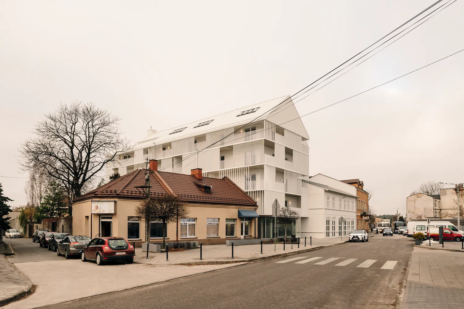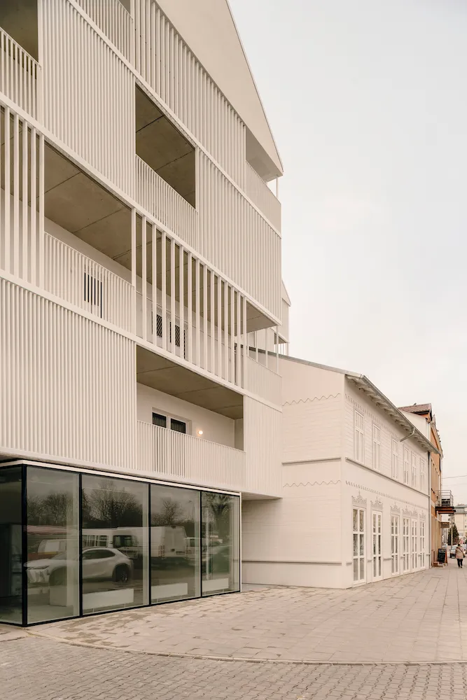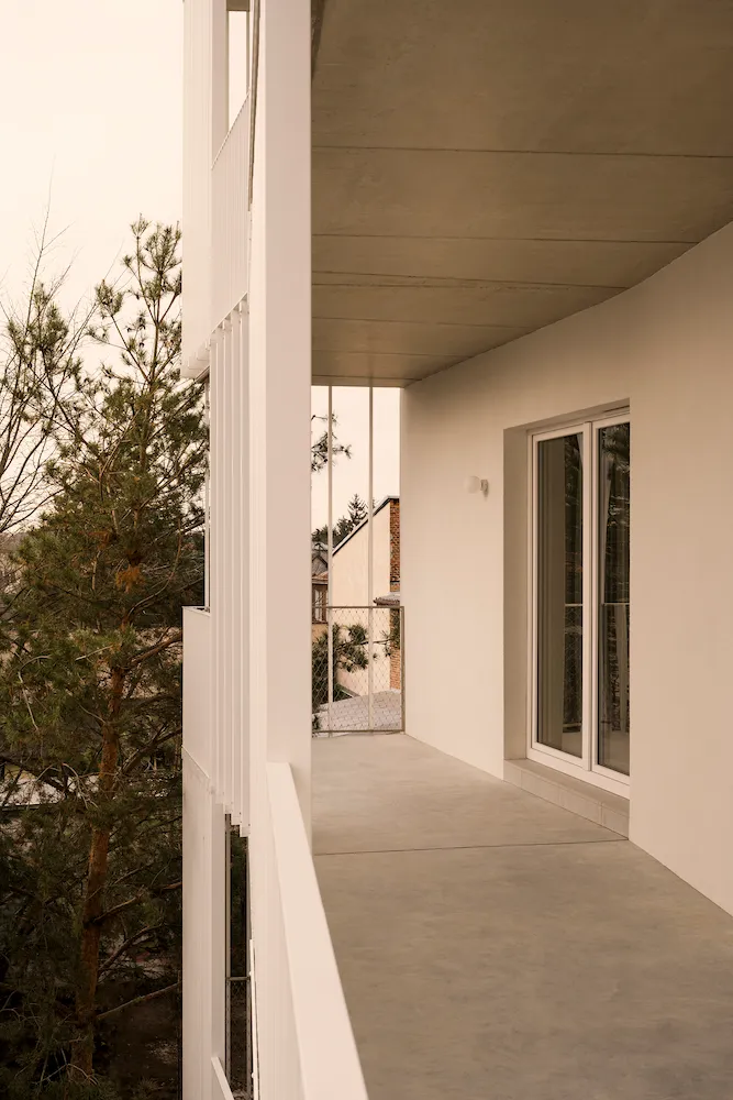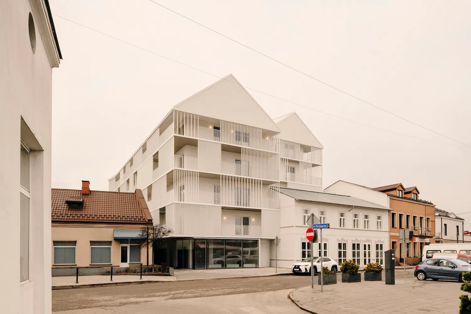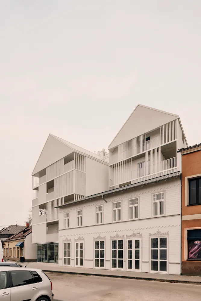 Bryła budynku podzielona została na dwie części o zróżnicowanym charakterze elewacyjnym oraz wysokościowym. Składają się na nią istniejący, dwukondygnacyjny budynek drewniany, oraz zupełnie nowa bryła o znacznie większych gabarytach. Jej prosta i delikatna forma w sposób przewrotny inspirowana jest stylem świdermajer, którego przedstawicielem jest niższy budynek. Przestronne balkony zostały zaprojektowane jako ażurowe werandy, doskonale nadające się do codziennego wypoczynku. Pionowe szprosy elewacyjne, z których składa się fasada, projektowane są jako elementy drewniane, malowane na kolor biały, który będzie dominującą barwą elewacji. Także malowana proszkowo w tym samym kolorze stal, z której wykonane będą zewnętrzne balustrady, korespondować będzie z ażurowym motywem fasady. Całość będzie ascetyczna w formie i kolorze dzięki czemu zyska ponadczasowy charakter.