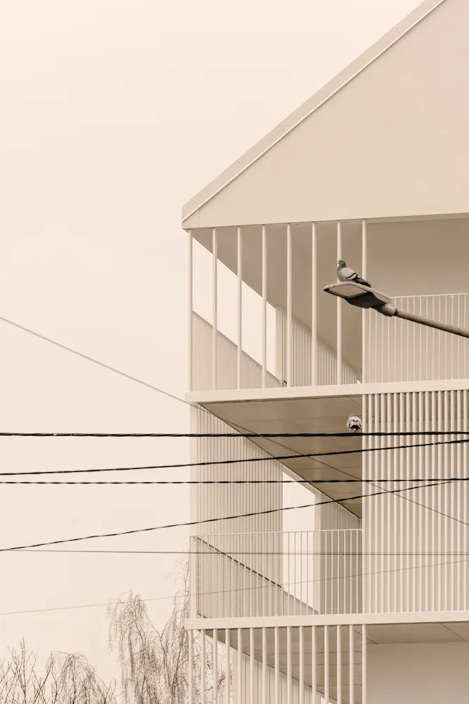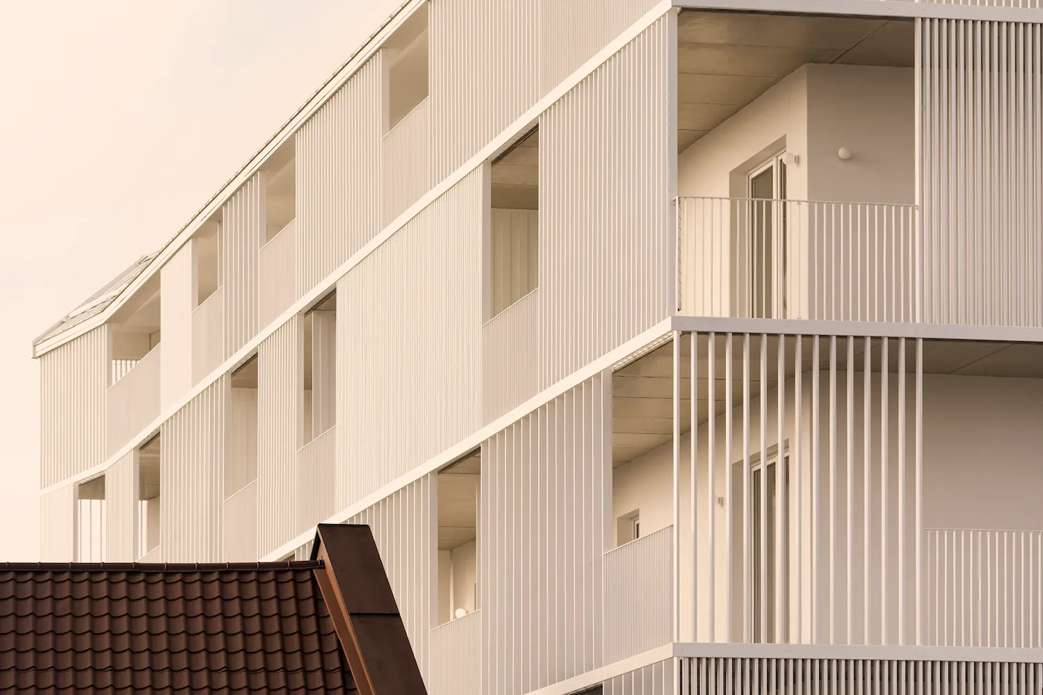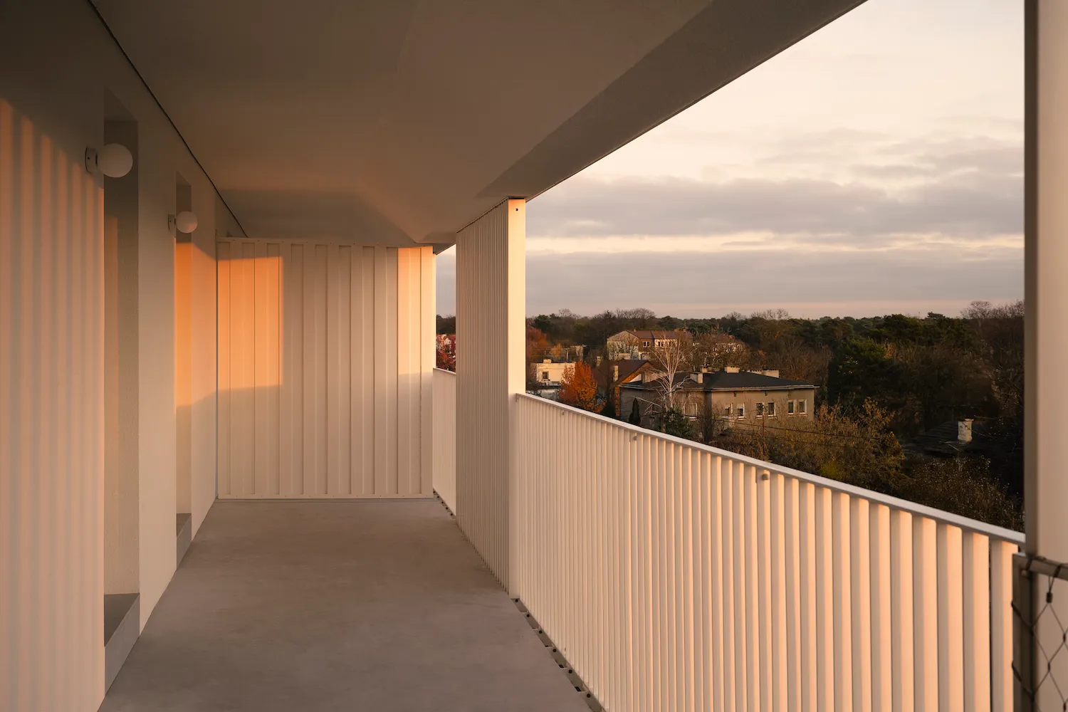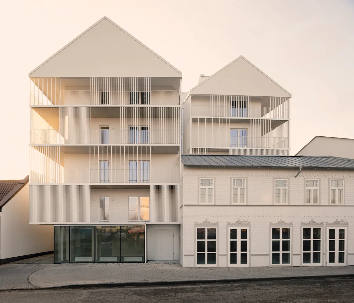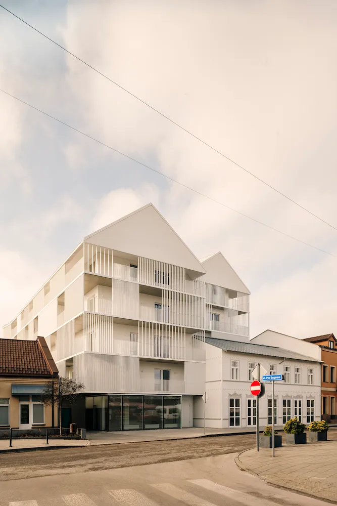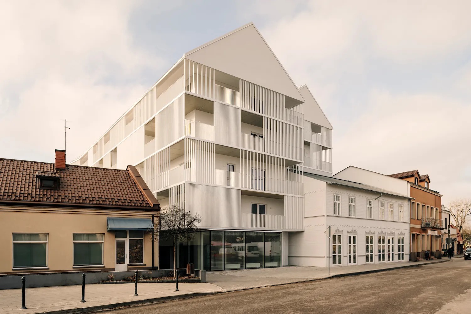 Bryła budynku podzielona została na dwie części o zróżnicowanym charakterze elewacyjnym oraz wysokościowym. Składają się na nią istniejący, dwukondygnacyjny budynek drewniany, oraz zupełnie nowa bryła o znacznie większych gabarytach. Jej prosta i delikatna forma w sposób przewrotny inspirowana jest stylem świdermajer, którego przedstawicielem jest niższy budynek. Przestronne balkony zostały zaprojektowane jako ażurowe werandy, doskonale nadające się do codziennego wypoczynku. Pionowe szprosy elewacyjne, z których składa się fasada, projektowane są jako elementy drewniane, malowane na kolor biały, który będzie dominującą barwą elewacji. Także malowana proszkowo w tym samym kolorze stal, z której wykonane będą zewnętrzne balustrady, korespondować będzie z ażurowym motywem fasady. Całość będzie ascetyczna w formie i kolorze dzięki czemu zyska ponadczasowy charakter.