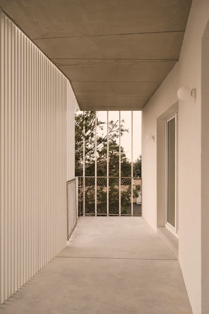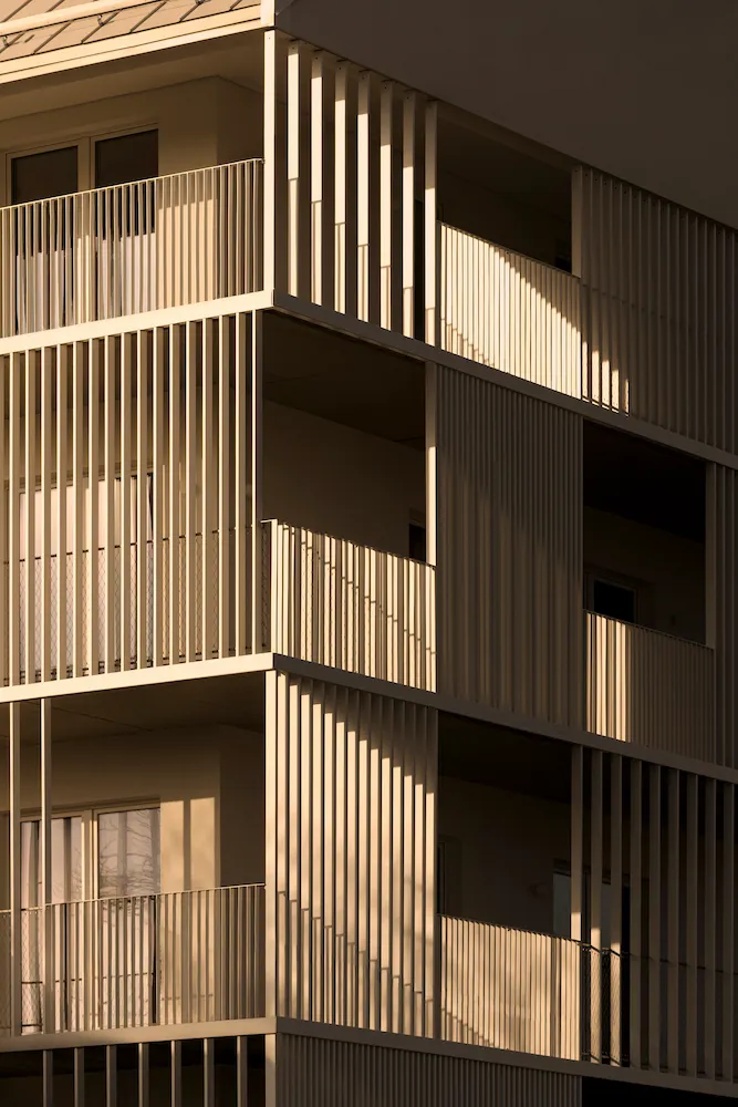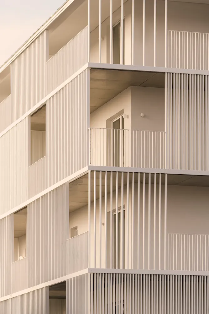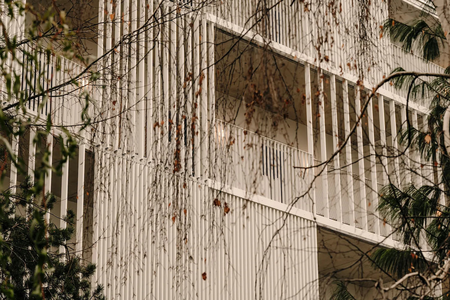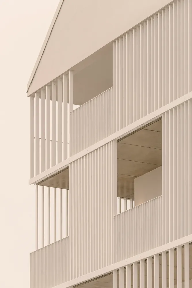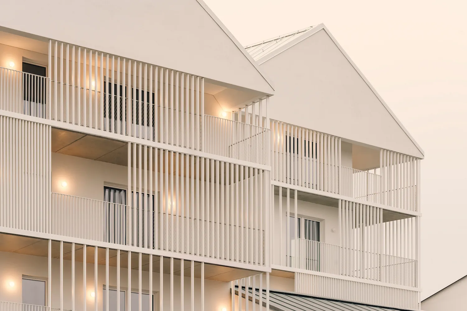 Bryła budynku podzielona została na dwie części o zróżnicowanym charakterze elewacyjnym oraz wysokościowym. Składają się na nią istniejący, dwukondygnacyjny budynek drewniany, oraz zupełnie nowa bryła o znacznie większych gabarytach. Jej prosta i delikatna forma w sposób przewrotny inspirowana jest stylem świdermajer, którego przedstawicielem jest niższy budynek. Przestronne balkony zostały zaprojektowane jako ażurowe werandy, doskonale nadające się do codziennego wypoczynku. Pionowe szprosy elewacyjne, z których składa się fasada, projektowane są jako elementy drewniane, malowane na kolor biały, który będzie dominującą barwą elewacji. Także malowana proszkowo w tym samym kolorze stal, z której wykonane będą zewnętrzne balustrady, korespondować będzie z ażurowym motywem fasady. Całość będzie ascetyczna w formie i kolorze dzięki czemu zyska ponadczasowy charakter.