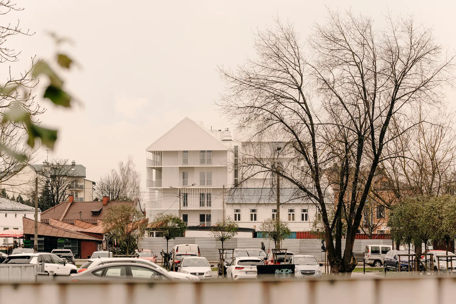 Bryła budynku podzielona została na dwie części o zróżnicowanym charakterze elewacyjnym oraz wysokościowym. Składają się na nią istniejący, dwukondygnacyjny budynek drewniany, oraz zupełnie nowa bryła o znacznie większych gabarytach. Jej prosta i delikatna forma w sposób przewrotny inspirowana jest stylem świdermajer, którego przedstawicielem jest niższy budynek. Przestronne balkony zostały zaprojektowane jako ażurowe werandy, doskonale nadające się do codziennego wypoczynku. Pionowe szprosy elewacyjne, z których składa się fasada, projektowane są jako elementy drewniane, malowane na kolor biały, który będzie dominującą barwą elewacji. Także malowana proszkowo w tym samym kolorze stal, z której wykonane będą zewnętrzne balustrady, korespondować będzie z ażurowym motywem fasady. Całość będzie ascetyczna w formie i kolorze dzięki czemu zyska ponadczasowy charakter.